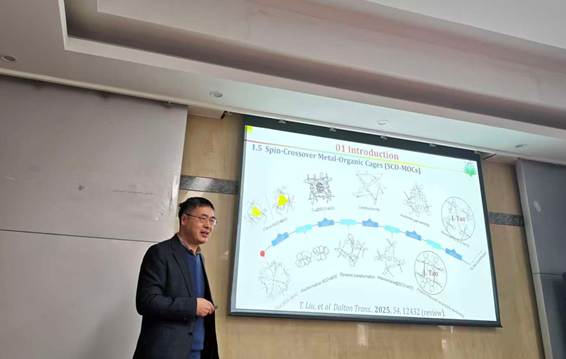 到访期间,陶军教授做了题为“自旋交叉笼的结构设计与性能调控”的学术报告。金属-有机笼(MOCs)是有机配体和金属中心构成的离散超分子实体,兼具结构的精准性与可进入的纳米空腔,这些特性衍生出了丰富的主客体化学性质。在报告中,陶军教授围绕其近年工作内容,重点讨论制备自旋交叉笼的结构设计思路,并介绍了通过多种化学方法实现对其自旋态、功能的按需调控。