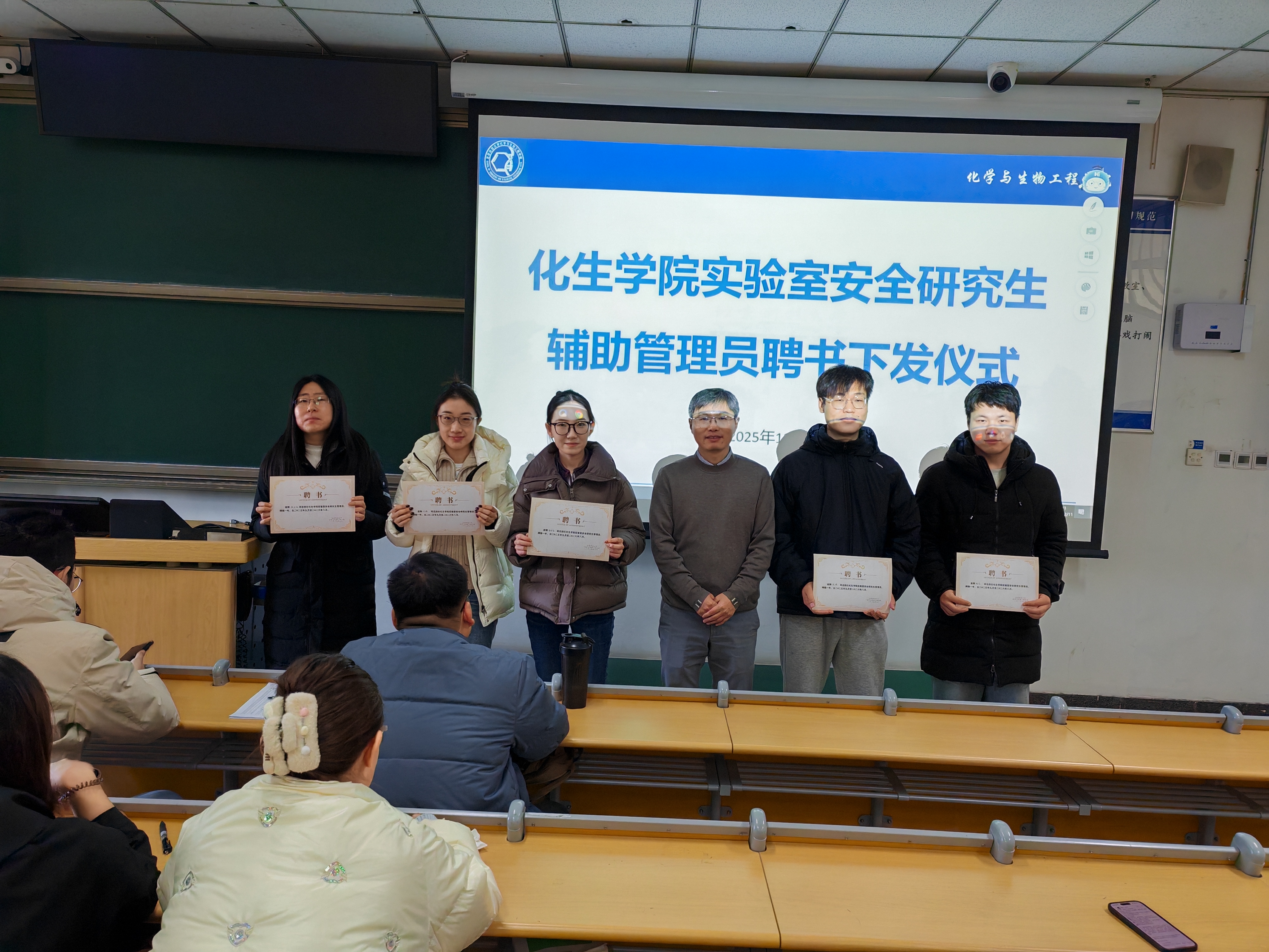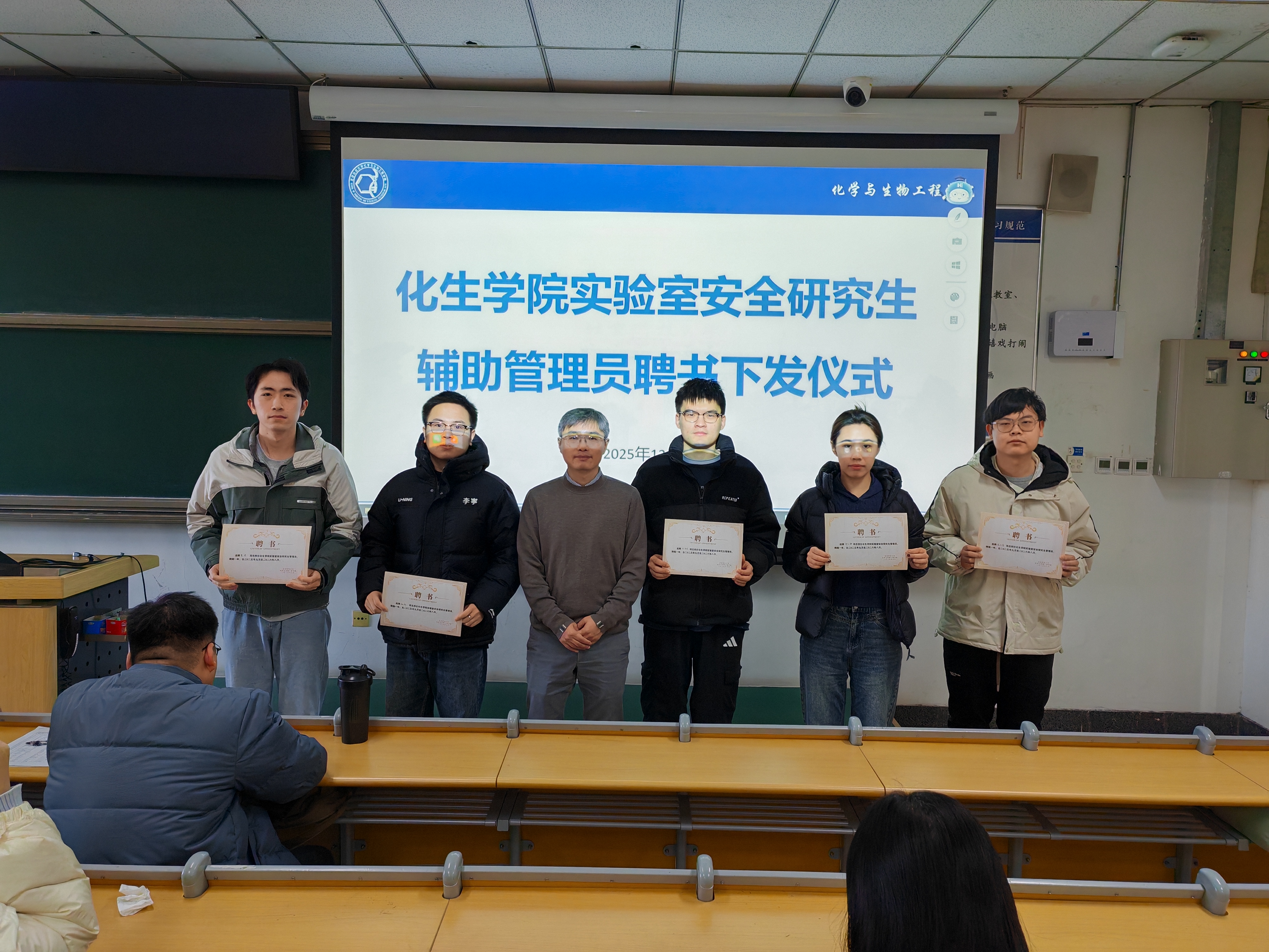 接着,王院长向研究生辅助管理员代表颁发了聘书。这份聘书既是对大家过往工作的肯定,也意味着一份厚重的责任。受聘研究生代表们纷纷表示,将以强烈的责任感和使命感投入实验室安全管理工作,切实履行好职责,不负学院信任。